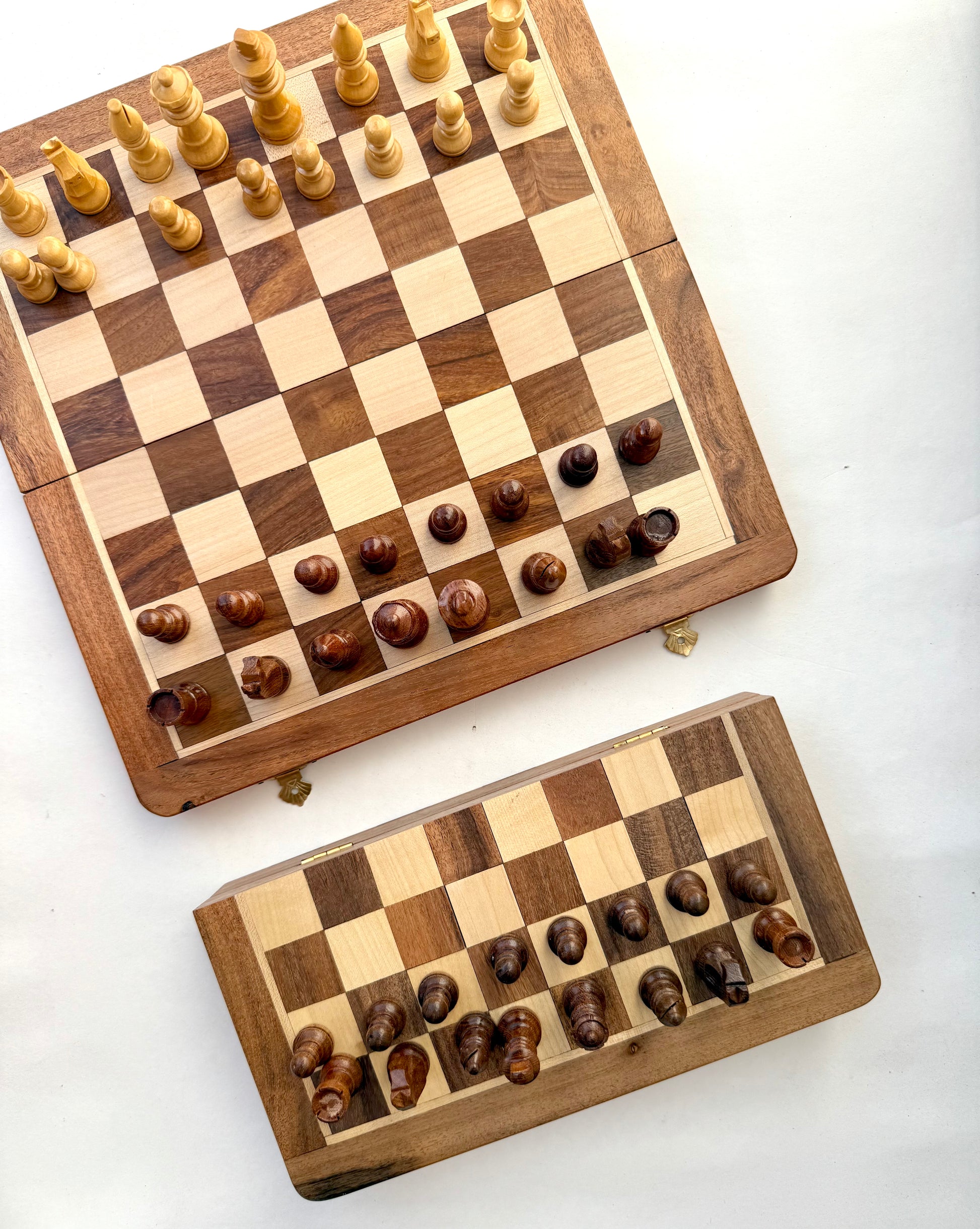 Made from premium wood, this wooden magnetic chess board keeps all chess pieces securely in place, making it ideal as a travel chess board. The board folds neatly into a compact case, transforming into a portable chess set that fits easily in bags, backpacks, or drawers.